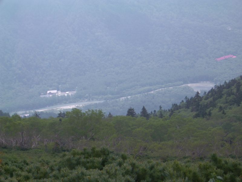 ・ガスの切れ間から眼下に上高地駐車場・・・・梓川・・・・帝国ホテルの赤い屋根