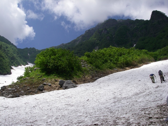 二股下15分から雪渓になった。疲れて、二股で大休止になった。