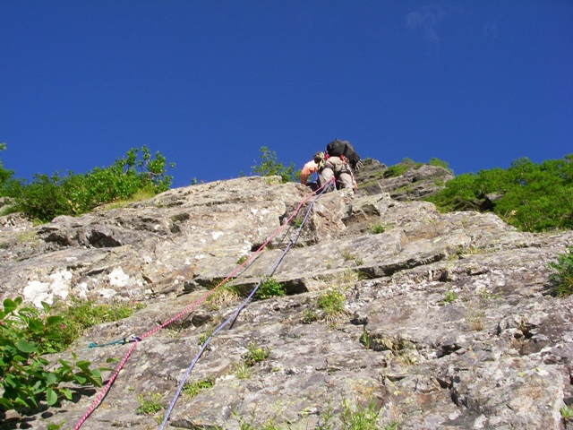 最近のルート図?では取り付きのハングをフリーで登るみたいですが、30年前は人工のルートであぶみが必要でした。我々はあぶみを持っていなかったので最近のルート図には載ってない30年前の正規ルートを行きました。まあ要は、左方面5尾根のブッシュを使ってハングを巻いただけですが・・・・・。