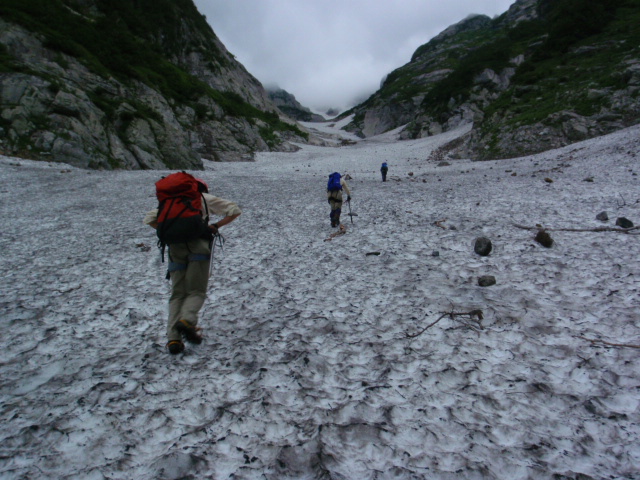 別山乗越から剣岳の全身像「岩の殿堂」を目の当たりにすることができました。ゴツゴツの岩肌にギザギザの稜線、いままでに登ってきた山とはまさに格が違いました。(今回の合宿中、見晴らしがよかったのは、ここまででした。あとはほとんど霧に包まれっぱなしでした)