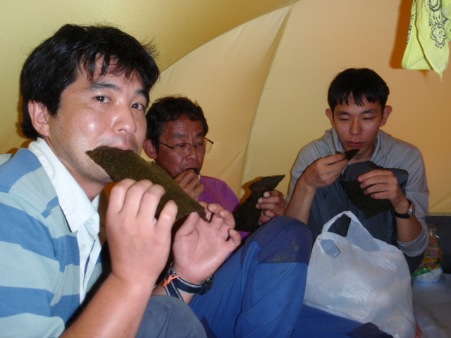 食後すぐ、5時ごろ就寝。男性陣テントの中に5人。メザシのように並び、先を競うように眠りについていくという様子でした。