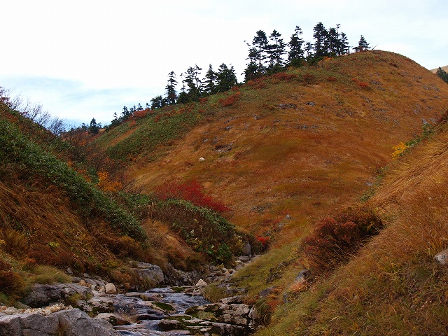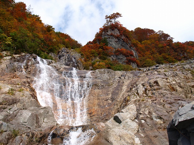 ナメ滝を過ぎ、幾つか簡単な滝を越えると沢相は狭く水量も減って、鮮やかな錦秋の木々が両側から迫ってくる。