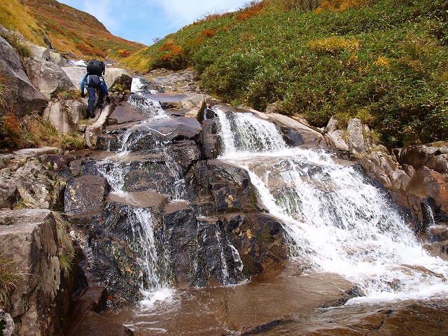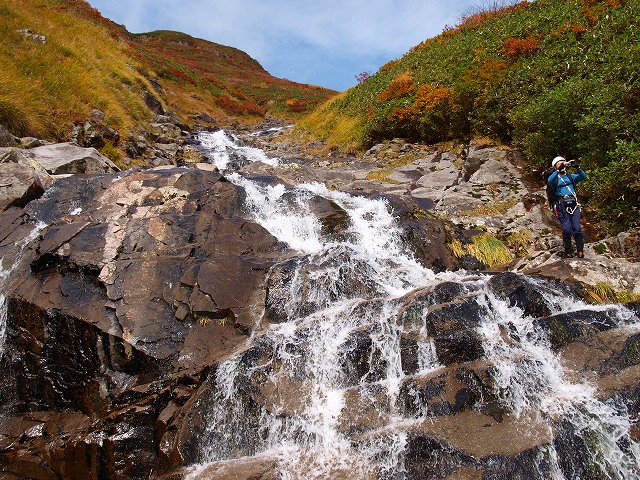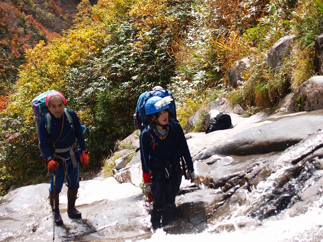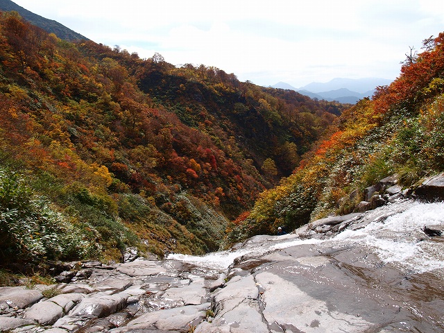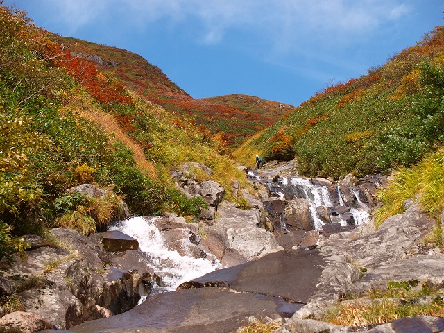 両脇の見事な紅葉、正面には青空を背景に巻機の稜線がたおやかに浮かんでいる。ヒタヒタと沢靴を濡らしながらの快適なナメの感触は沢登りの醍醐味の一つだ。