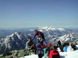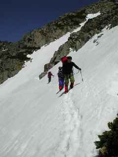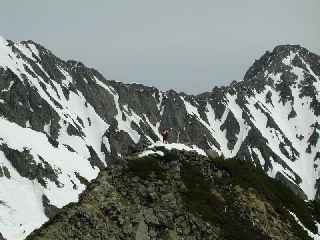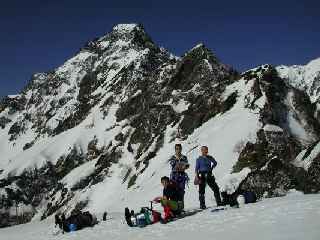 雪が全くない!ズック!ズックですよみんな! ヘルメットかぶり、ハーネスつけて違和感たっぷりでした。11:00に頂上で縦走してきたメンバーと落ち合いました。添付写真からも雪の状態がわかるでしょ!デジカメが3倍ズームまでだったので小さく写ってしまいました。ごめんなさい!しばし休憩後全員で西穂沢の下降を行う。出だしは急だが雪が腐っていて滑落の心配なし。よって浦和溪稜伝統の全員ばらばらマイペースの下降になる。なんだかんだいったって一番楽しいひと時だったような気がします。グリセードはいるは、歩きはいるは、シリセードはいるはで、かっとんで、あっというまに見えなくなっていった人もいました。テン場には13:30帰着。