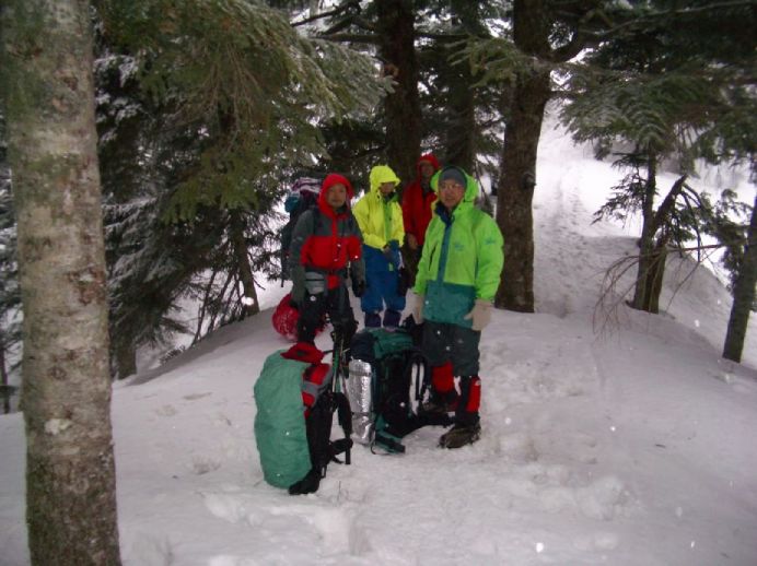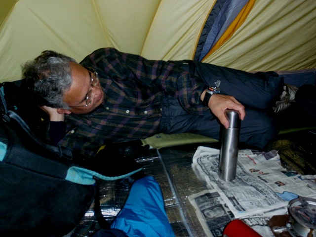 ・予想通り今日は天候悪化、夜半から風でテントが少々あおられる、2:30に起床するが天候不順のため、安田Lより
