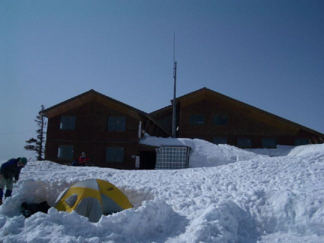 ・西穂山荘とテン場、中央の大き目のテントが我々のテント
