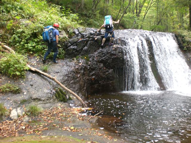 今回の二つ目の滝に出合う。ハダカゾウキ沢の出合にある大滝(?)である。登り口まで滝つぼが広い。「あすこから、ここへ、そして、あすこへ」と遡上イメージつくるが、落ちれば、ここまで戻ってくるには泳ぎか。