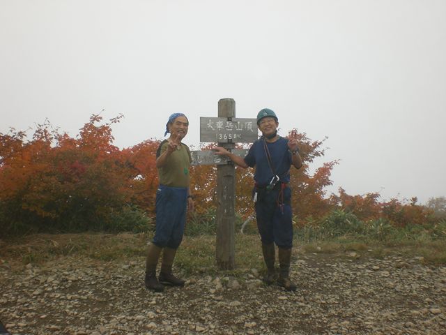 悪戦苦闘すること3時間近く、頭上のヤブも矮小化してきた。何度ものヤブこぎの経験上、そろそろ稜線にでそう。「ヤッター」汗まみれの目の前に、道が。とうとう稜線にたどり着く。5分も歩くと、そこは「大東岳」の山頂だった。