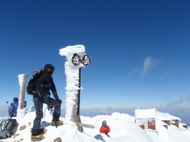 途中道が細くなったり、傾斜が急になりピッケルの効率的な使い方を教わりながら頂上直下へ