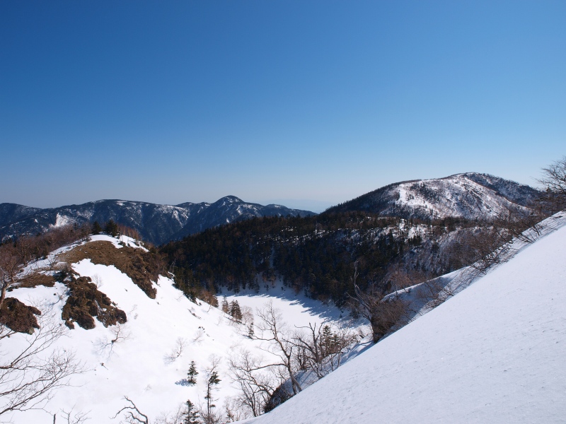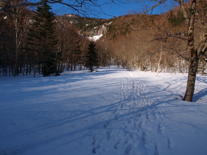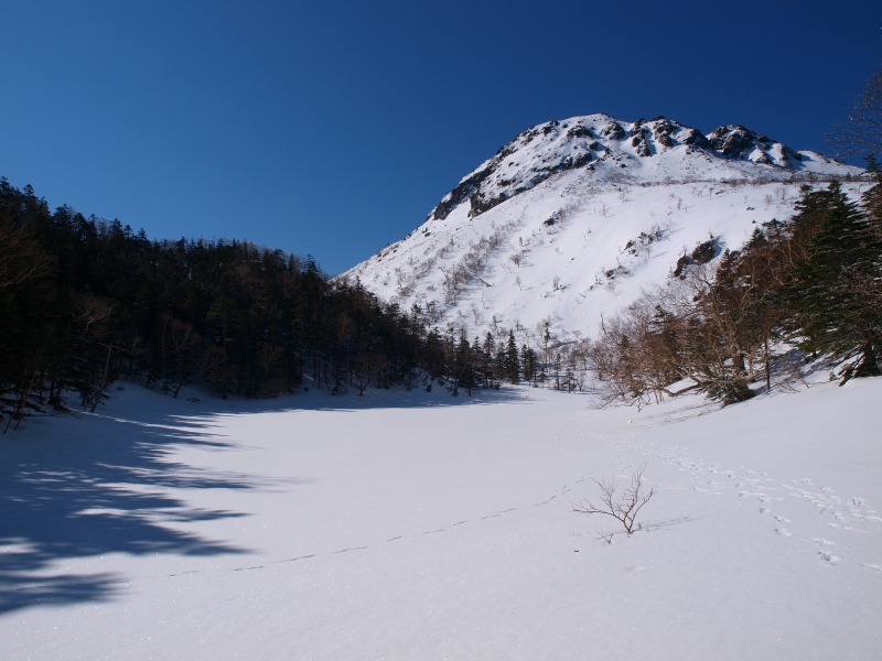 弥陀ヶ池までは夏道ではなく沢沿いのトレースを辿る。池は雪に覆われ広い雪原になっていた。