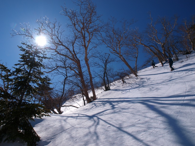 しかしこれだけ斜面のクラストが厳しい場合「底面をフラットに置く」などという戯言は全く通用しない。それこそ爪先が痛くなるくらいキックステップで前爪を蹴り込まないととても安全な登高など出来はしない。