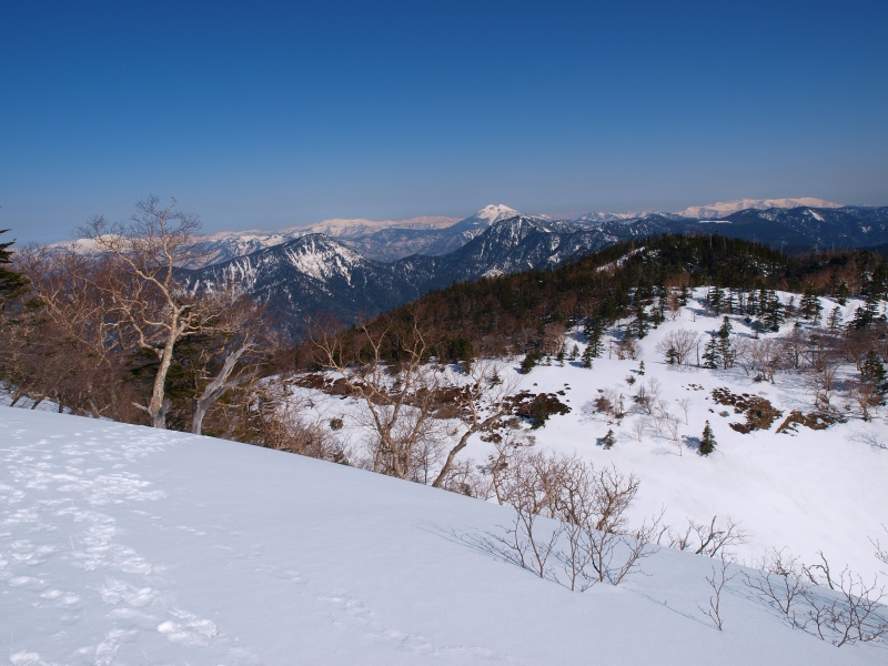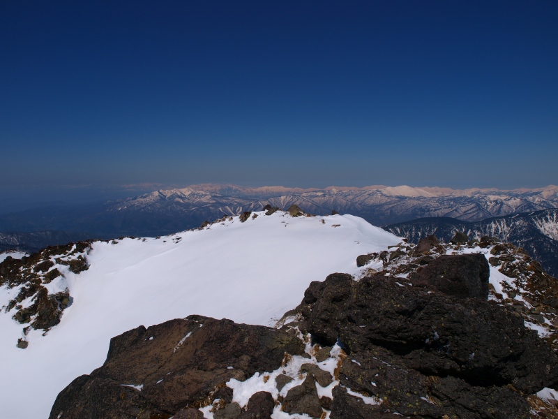 夏道は雪に埋もれ固く凍り付いたルンゼ状を直登気味に登る。アイゼンを蹴り込んでも殆ど刺さらない。ピッケルを突き立てジグザクに高度を稼ぐと程なく白根山の山頂に辿り着いた。