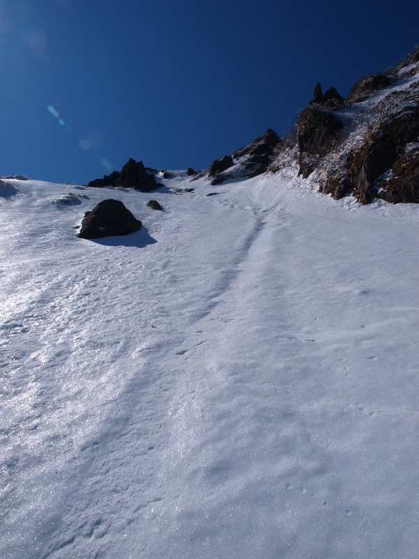 ここより頂上直下の台地まで一登りだが雪面は固く凍り付き、アイゼンの先端も僅かしか食い込まない。頂上直下のルンゼ状はかなり緊張感を強いられそうだ。