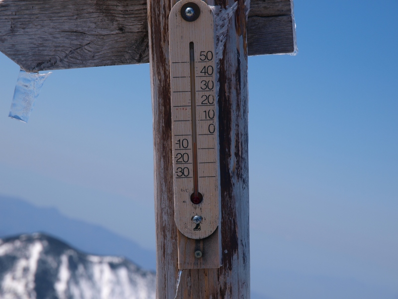 気温が上がってきたものの頂上の温度計はまだ−5℃近くを指している。期待通り快晴の元、360度の展望が待っていた。