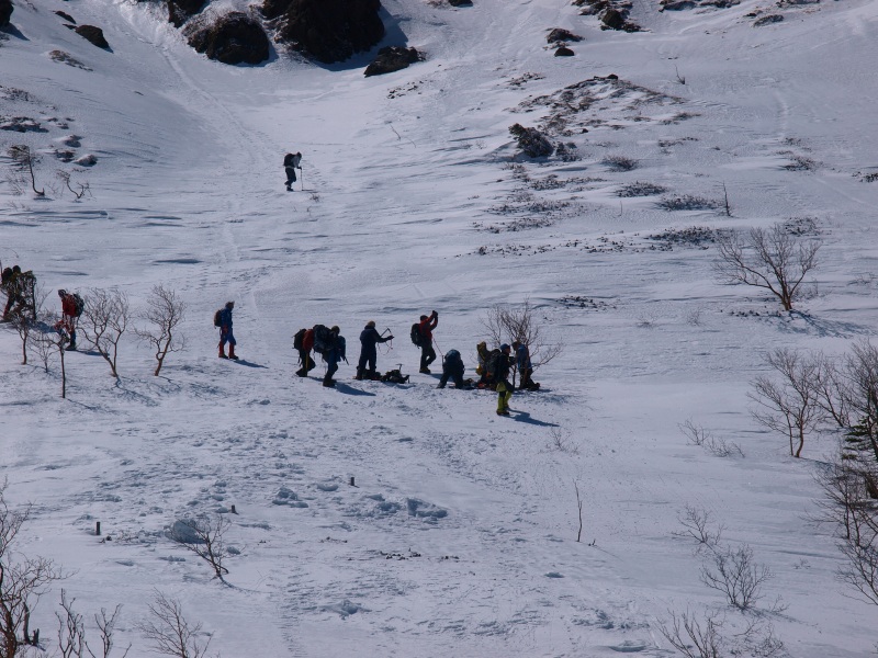 更に斜面を下るとなにやら下の方に人だかりが小さく見える。レスキューシートを拡げて雪上訓練か?
