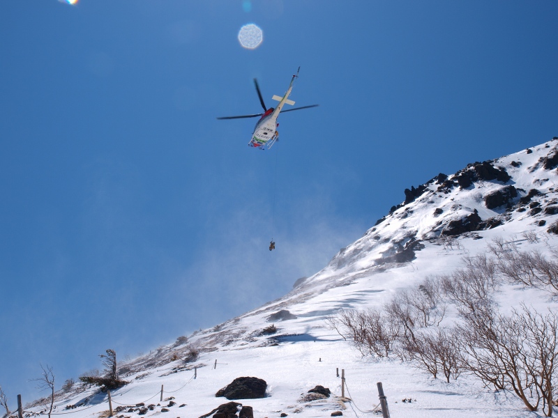 助太刀の必要性を聞くと既にヘリがこちらに向かっているので不要とのこと。そのうちに遠くから爆音が響いてくる。その場を「仕切ってる」どこぞの登山者に任せ、サッサと下山することにする。