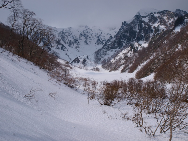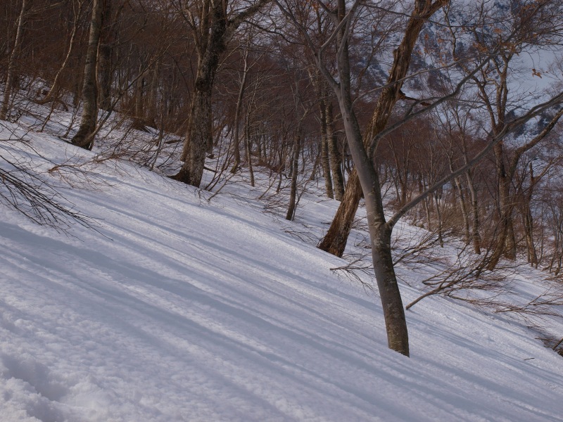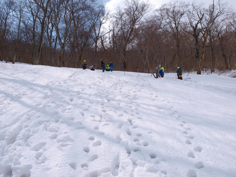 斜面の木々の影が長く伸びてきたので訓練を終え雪解けに濡れる林道を戻り帰途についた。
