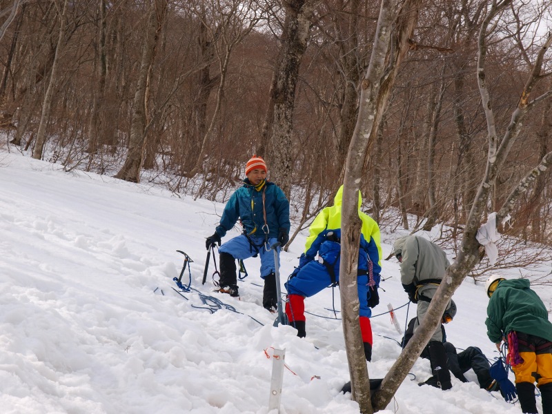 出合より厳剛沿いを10分程登ったところのやや急な斜面を訓練場所に定め、アンカーの取り方から講習を開始する。