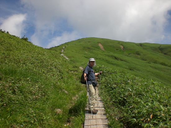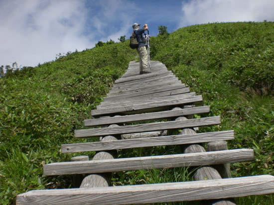 ここまでも階段状の道がところどころ続いていて閉口したが、ここからも、木道と階段状の道が延々に続いていた。