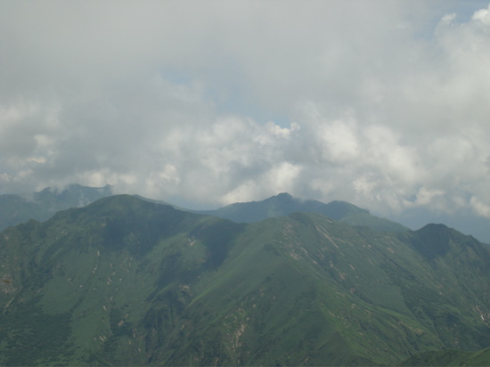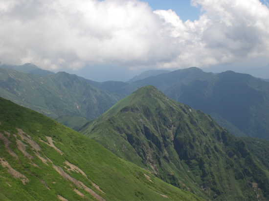 山頂からはエビス大黒の頭〜万太郎山〜谷川岳へとつづく稜線が夏雲の彼方にあった。