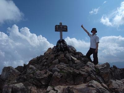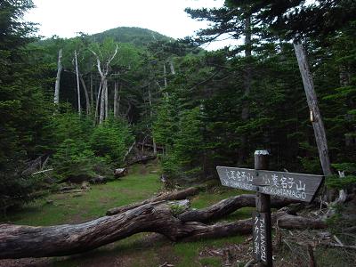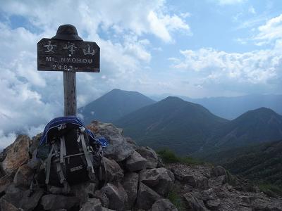 行き先は見えるものの尾根が曲がっていて女峰はまだ遠い。コルの水場が出ていたので水汲みをして再出発。稜線に上がると女峰山頂の道標が誇らしく見える。ほどなく山頂到着。写真撮影で遊ぶ。