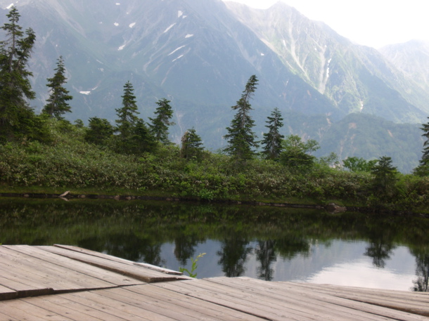 残念ながら池に映る穂高連峰はガスのため全景は望めなかったが、ここにテン場があれば最高にご機嫌の場所である。