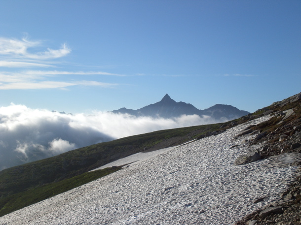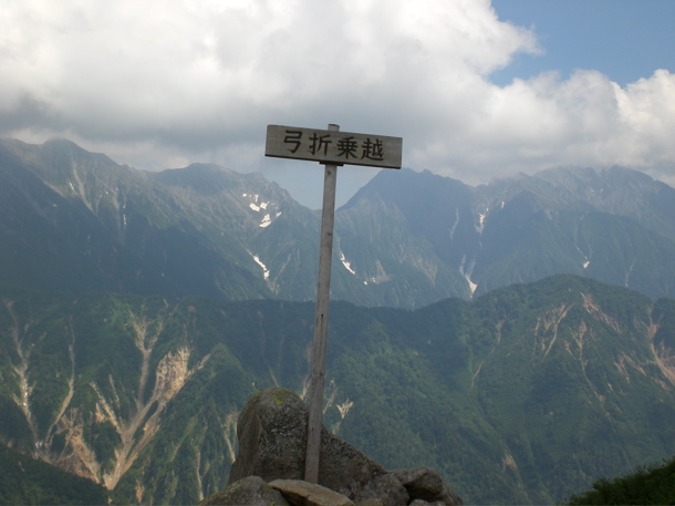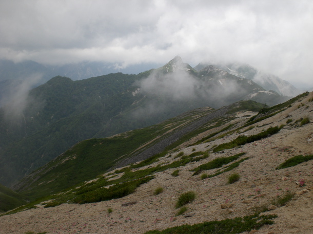 槍・穂高の全景はまだ雲の中だったが、笠ヶ岳が姿を現わしている。お決まりの証拠写真を撮ってもらい、三俣蓮華へと向かう。