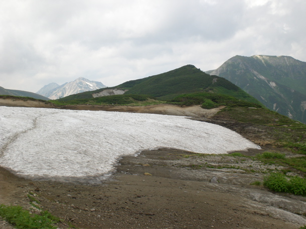 ※ 雪田の中につづくトレース 左後方にかすかに鷲羽岳が