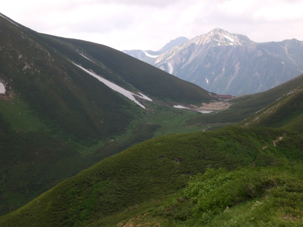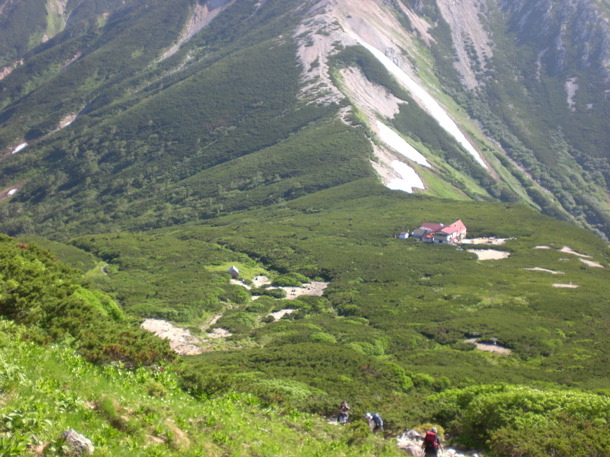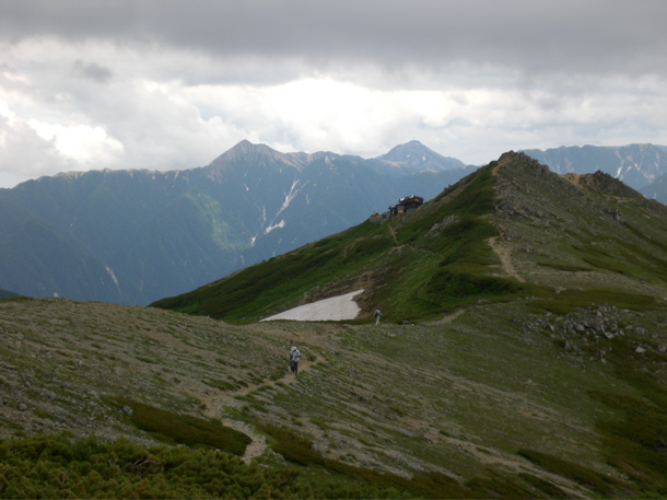 ※水晶よりの帰り道 小屋の奥に常念、その左は大天井岳