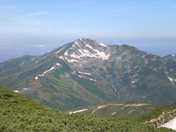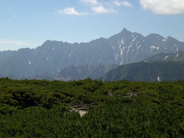 途中、丸山の登りあたりから北側も雲が切れてきて、黒部五郎の見事なカールが望めた。その右には薬師の雄姿も。
