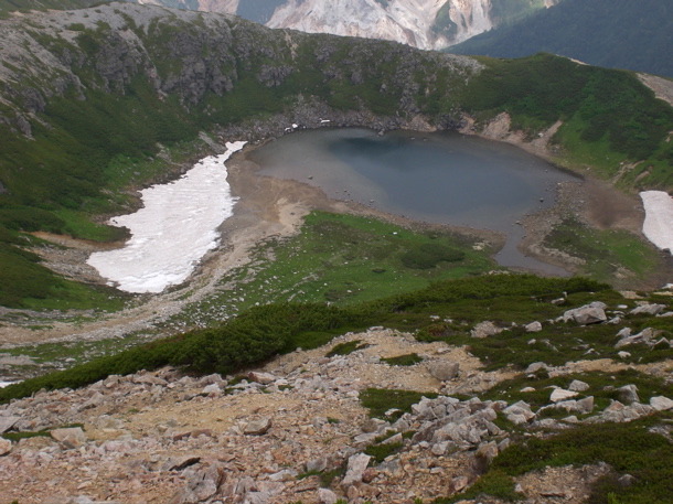いよいよ、山頂間近か? 右手眼下に紺い水を湛えた鷲羽池が望めた。