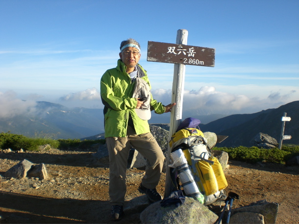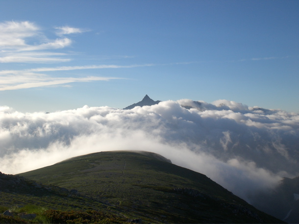 ちょっと迷ったが、素直に指示に従い、昨年同様、「中道コース」を行くことにする。途中、ご来光に手を合わせ、朝露の中、お花畑の気持ちいい道を進む。そのまま行くと双六岳と丸山の鞍部に出てしまうので、途中、左に上がる道がついていたので、そのトレースを辿って行くと、山頂につづく「稜線コース」の道に出くわした。もう、そこからは山頂は指呼の距離。