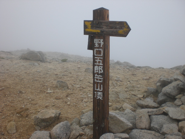 戻り、野口五郎を目指す。風が強くなってきた。雨が降っていないだけまだいい。瓦礫のジグザグの道がつづく。ガスの中に突然、人影が現れたかと思ったら、そこが山頂だった。