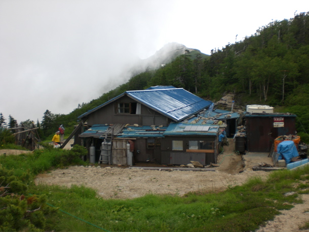 野口五郎小屋に下りた頃には晴れ間もでてきた。大休止。(かつてはテント場があったが、ここは風が強く、小屋のトタンが飛ばされたり、テントが飛ばされたりして危険なので、いまでは無くなった、と小屋の人が言っていた)