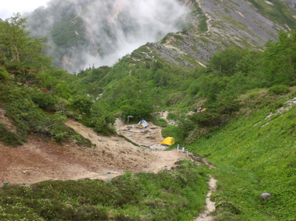 烏帽子ヒョッタン池のテント場に下り着く。花咲き乱れるとてもいい場所である。ここに水が流れていれば、最高なんだが・・・。