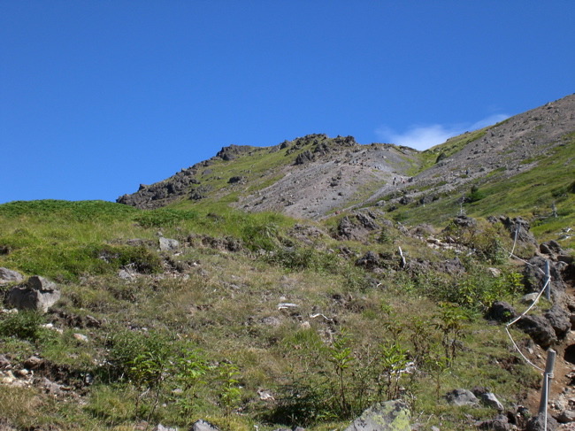 ※山頂駅より白根山 右手の森林帯を巻き気味に登り、砂礫を左上する