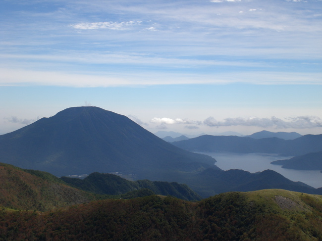 10時15分、2578米の山頂に着、関東以北の最高峰である。男体山、中禅寺湖、太郎山・・・・。眼下には五色沼、弥陀ヶ池、菅沼などの湖沼がはっきり見える。五色沼避難小屋方面の木々は少し色づいているようだ。