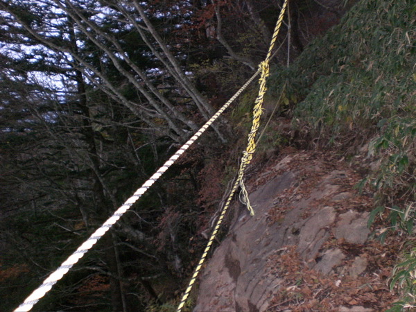 急峻な岩場に架けられた梯子、鎖、梯子、ロープ・・・・を過ぎるとやっとやや道も緩やかになり、熊笹の茂る森林帯にでた。この先はもう平坦のようだ。