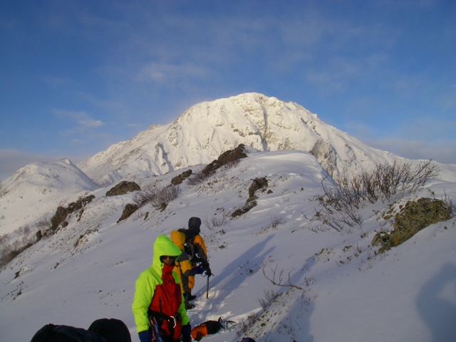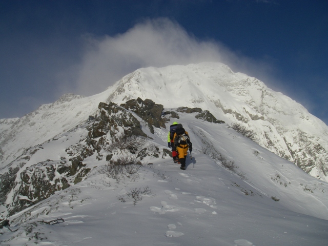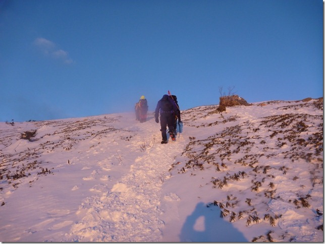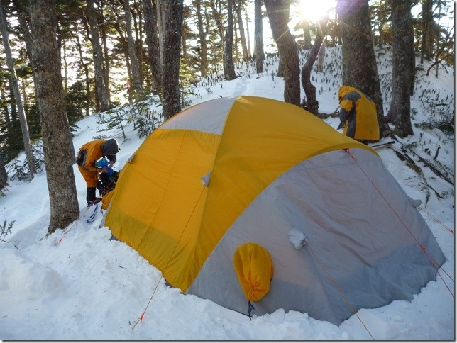 避難小屋からトレースをたどって城峰を越え、更に一時間ほど登った尾根のコルにテントを設営した。