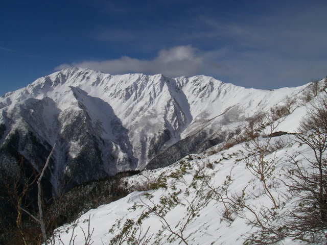 八本歯のコルからの雪煙舞う北岳の斜面。