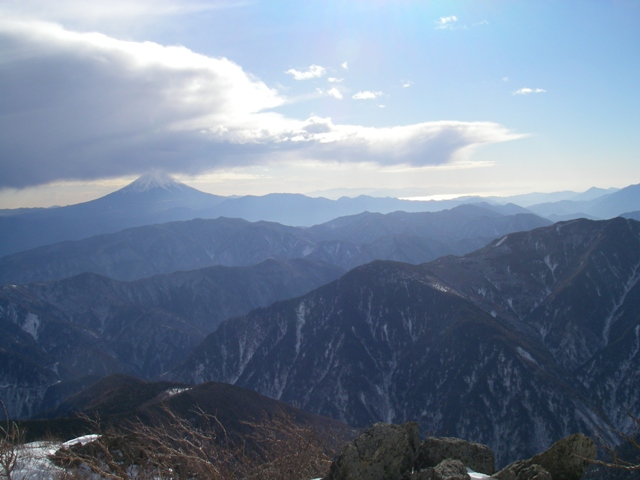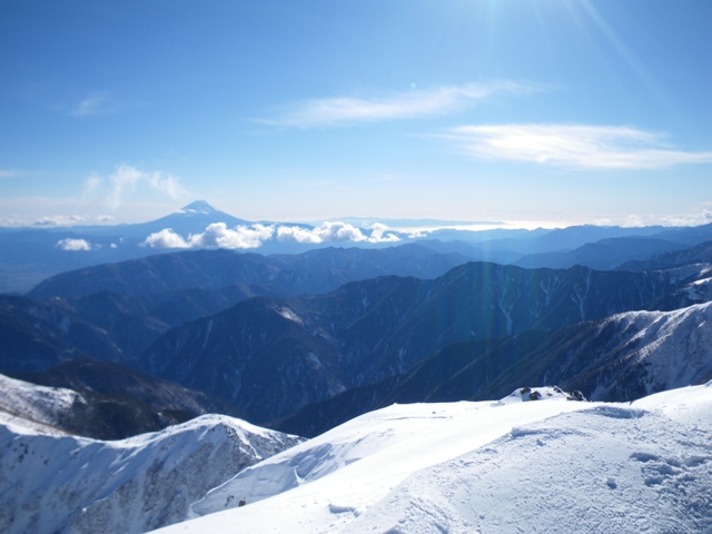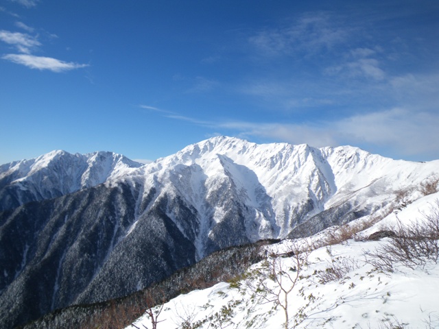 仙丈岳と北アルプスも鹿島槍までくっきり。こちらの写真も年賀状用か。