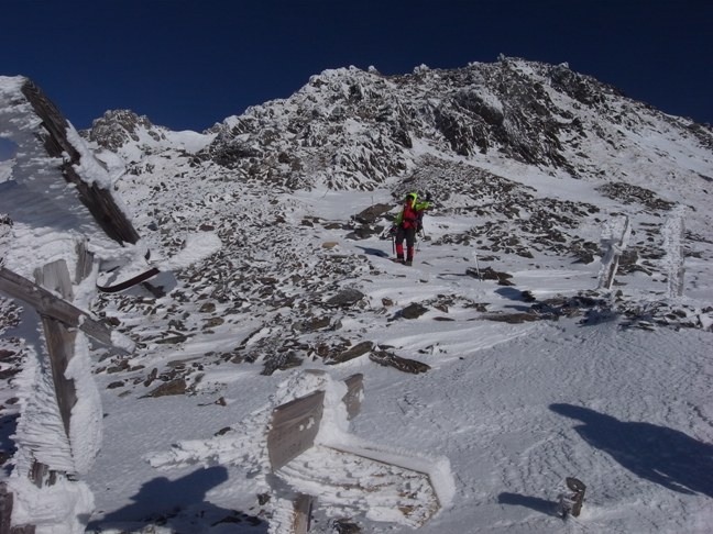しかも風が強いし雪煙は上がるは、雪面はバリバリにクラストしている。