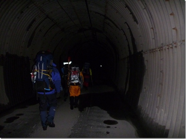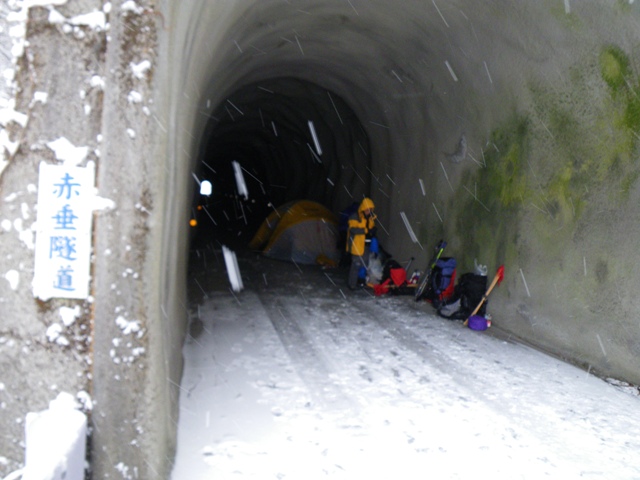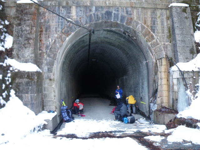 雪が湿雪でヤッケや手袋が濡れたのでトンネルに入ってしばし休憩。