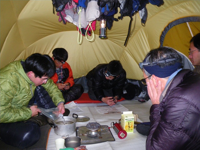で、一安心。早速、テントの中では干し物と酒盛りが始まった。