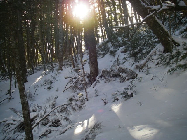 ボーコン沢の頭下で明るくなってきた。少し天気が回復傾向か?