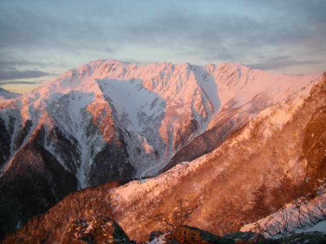 間ノ岳のモルゲンロート。アルペングリューエンだ。
