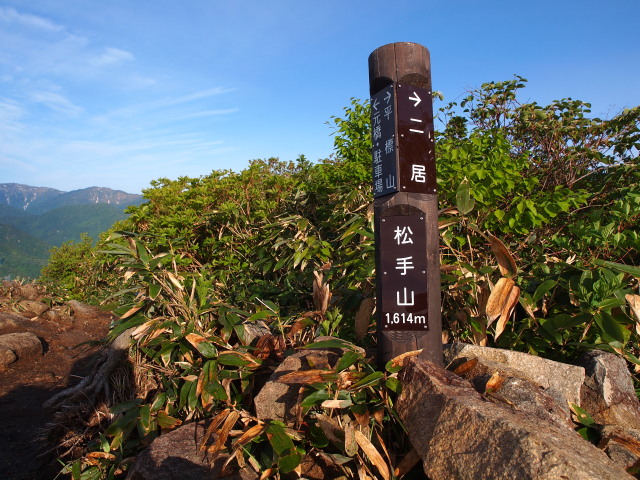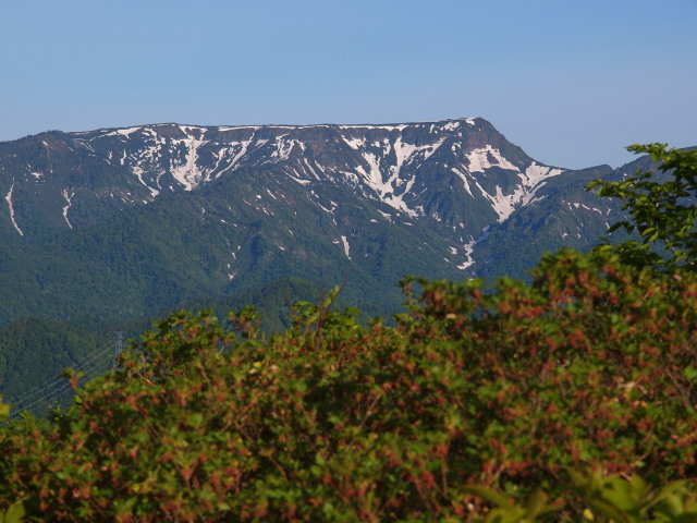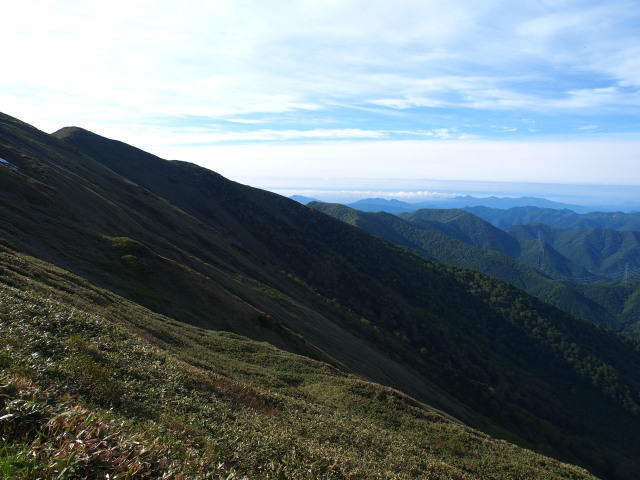 濡れたクマザサに足を取られながら高度を上げてゆくと視界が大きく開け、振り返ると苗場山。
