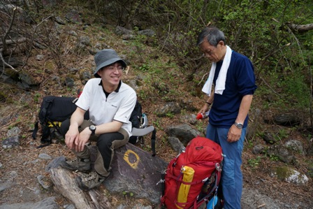 橋を渡ったところで休憩。O氏、その虫よけスプレー缶は大きすぎ。