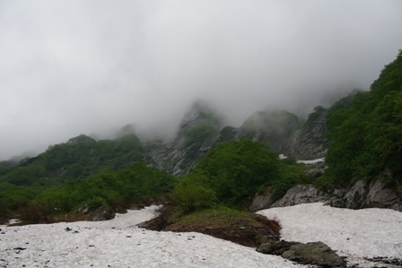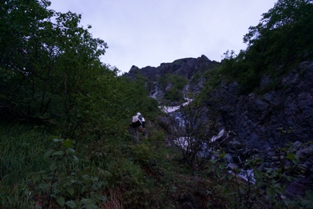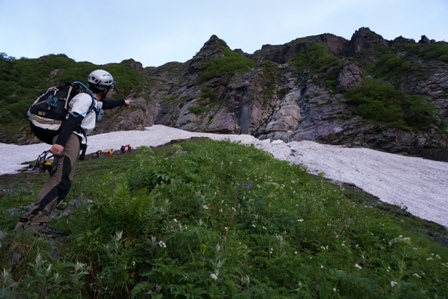 日が昇る頃に下部岸壁下に到着も雪渓が残る。去年はここには無かったのに、やっぱ毎年状況は違いますね。