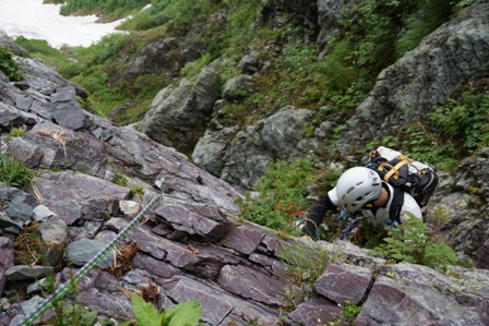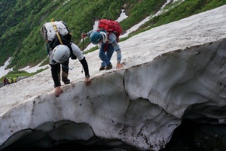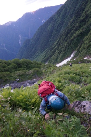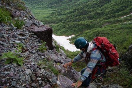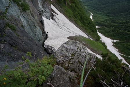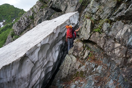 ピッケルを持たなかったこともあり、雪渓のふちを持ったりして恐る恐るトラバース。